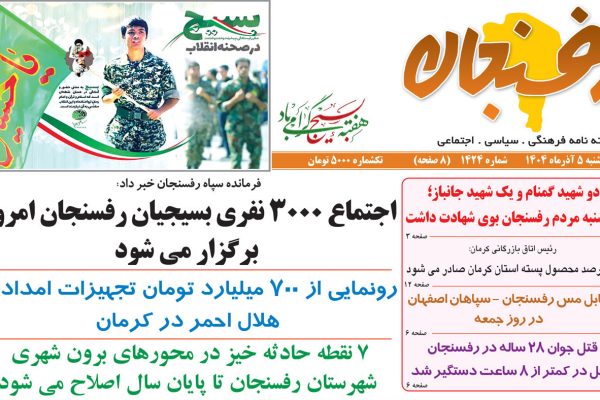 برای دانلود فایل pdf این هفته کلیک کنید همچنین می توانید جهت دریافت اخبار به روز و مشاهده صفحات #هفته_نامه_رفسنجان ما را در فضای مجازی هم دنبال کنید پیام رسان سروش پیام رسان ایتا پیام رسان بله پیام رسان روبیکا